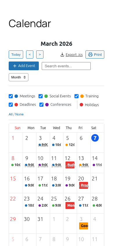 - Month, week, and day views with AJAX navigation and real-time category filtering